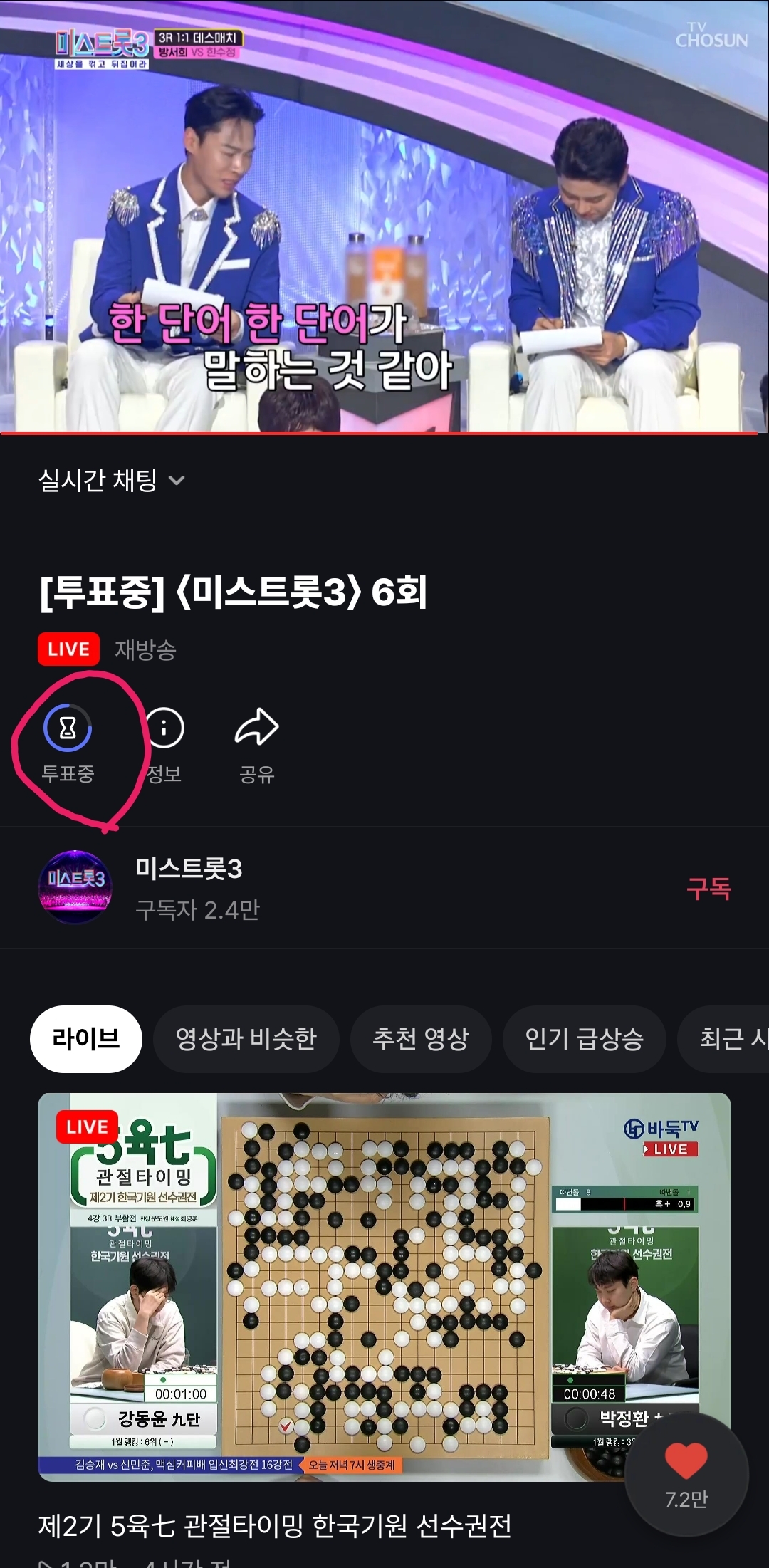 미스트롯3 라이브 재방송 화면 아래에 있는 '투표중' 버튼을 선택합니다.